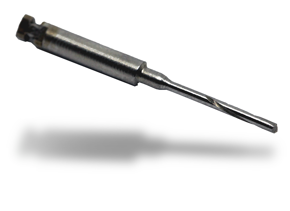 0.9 mm diameter drill. For hard cortical bone and re-insertion situations.